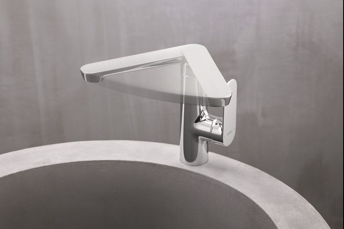 Bei den wandmontierten Bad- und Duscharmaturen sitzt der Hebel seitlich – markant in der Form und bequem in das Gesamtdesign integriert.
