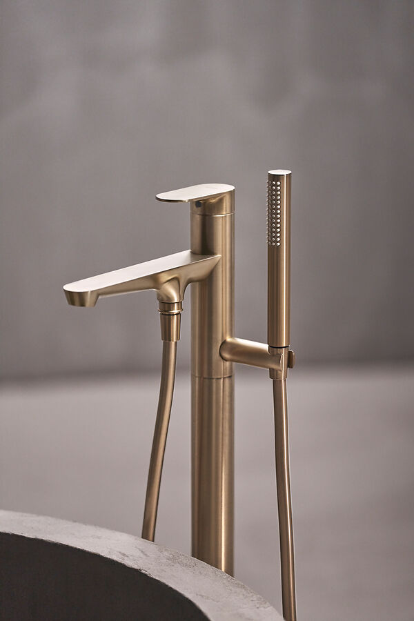 Die freistehende Badewannenarmatur hat eine starke und skulpturale Präsenz, die durch einen Sockel erhöht wird, der die klaren, vertikalen Linien verstärkt.